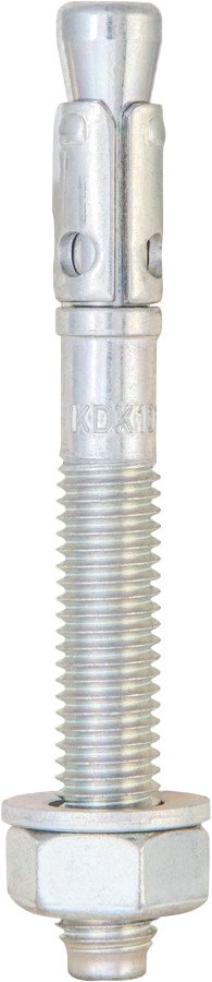 Анкер из оцинкованной стали состоит из распорной втулки, шпильки с резьбой и конусным концом, а также фиксирующей гайки с шайбой.